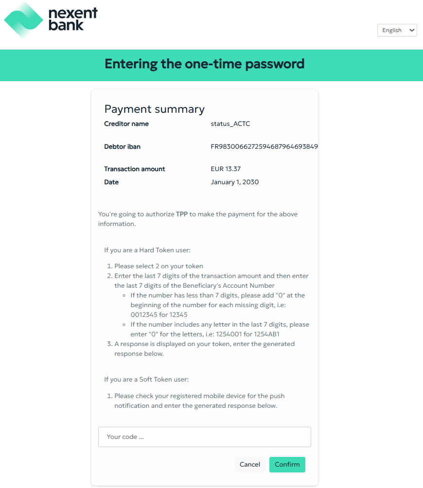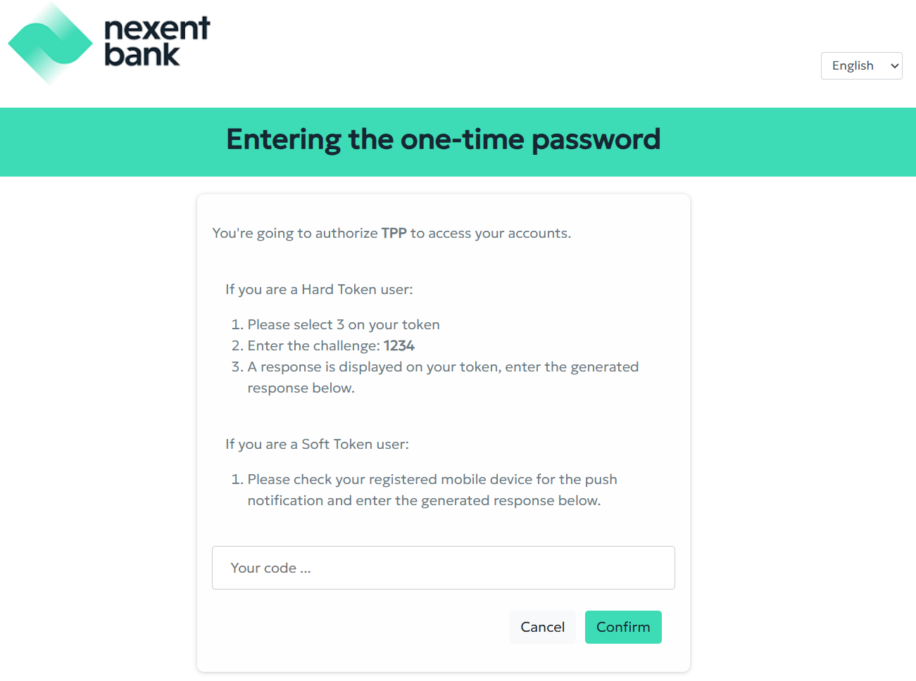 According to the Berlin Group Implementation guidelines, there can be different methods for the PSU to carry out its strong authentication. Nexent Bank is supporting the following one(s):